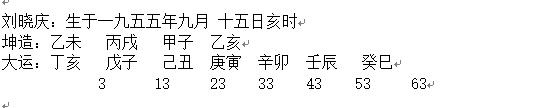 再如刘晓庆的八字与名字,关于刘晓庆的出生时间,有两个版本,一说1955年10月30日,一九五五年九月十五日。我以下面生日分析: