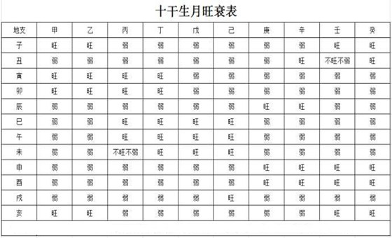 是根据十干与月令的生克关系,并融合古人的十干生旺死绝表,总结整理出的十干生月旺衰状况图表。