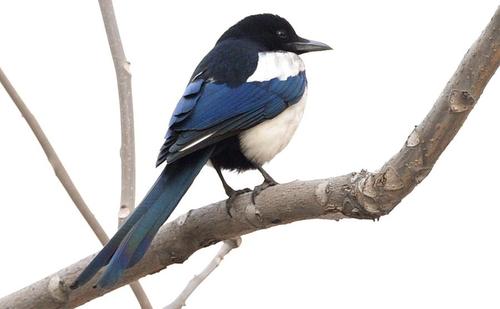 喜鹊(学名:Pica pica)是鸟纲鸦科的一种鸟类。共有10个亚种。体长40~50厘米,雌雄羽色相似,头、颈、背至尾均为黑色,并自前往后分别呈现紫色、绿蓝色、绿色等光泽,双翅黑色而在翼肩有一大形白斑,尾远较翅长,呈楔形,嘴、腿、脚纯黑色,腹面以胸为界,前黑后白。留鸟。