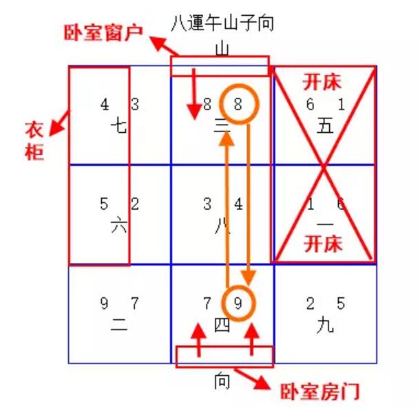 既然卧室已经确定开在坤宫,那么接下来的工序,就是设计卧室内的家具结构。凭据大原则,以卧室单自力极丈量,详见下图所示,床位安置在西方兑宫与西南坤宫区域,双双引发旺气【一六同宗】(合河洛数)。注重床头须朝向南方,吸纳离宫适时【8/8】旺气。卧室房间门则何在北方坎宫位置,引入未来九紫旺气,并与南方离宫的卧室窗口,形成南北气流相同之局,从而引发旺星八白与九紫。此与住宅的风水款式杀青同步效应(南北对流,旺星引发),其吉应威力获得进一步的增强,建议房门与窗口历久打开,让气流保持流通。此外,写字台可以安放在窗台区域,坐位面朝南方离宫双八,主大利学习及事情。衣柜则布置于东方震宫与东南巽宫区域,变相化解了震宫【二五交加】及巽宫【三四】之煞气。俗话说:旺位宜动不宜静;凶为宜静不宜动。衣柜的功效正好相符宜静不宜动之要求。