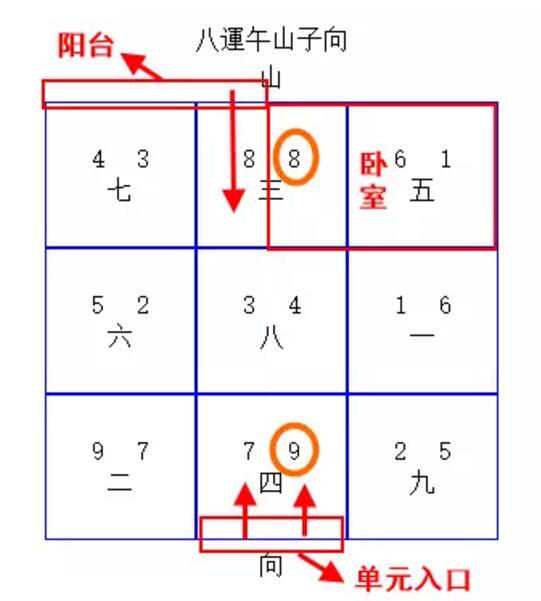 详见以下九宫图所标,此住宅定向为八运【午山子向】,属于旺运旺向款式。单元大门入口开在北方坎宫位置,从而引入未来旺星九紫旺气。阳台方则位于南方离宫区域,宫中向星为当运旺星八白,引入之气自然为吉。这样一来,阳台气口与单元大门成南北正对,由此八白与九紫两大旺星得以相同,较终引发全屋旺气。卧室则开在西南方坤宫位置,宫中星曜配卦为合河洛数【一六同宗】,主发名气及利于康健,这样便相符吉应之条件。