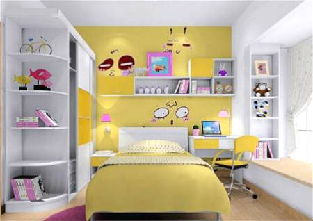 儿童房间颜色不能仅仅根据大人的爱好选择,比如你喜欢蓝色,儿童看到之后也许会觉得蓝色很暗,他们可能不喜欢这些,因此儿童房间颜色选择一个基调就是亮色,常见的亮色有绿色,黄色,红色,等等,由这些基本颜色衍生的色彩也有亮色系。比如说儿童床墙壁上,除了使用墙纸之外,墙面夜色也要注意,比如常见的橘红色就是很多人较爱,橘红色给人的感觉比较温暖暖,也比较适合儿童。
