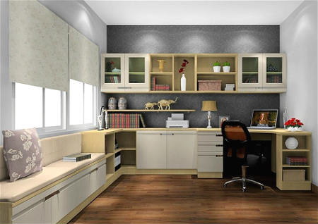书房颜色一般以浅色为主,如浅绿色、浅蓝色等,这样有利于精心学习。而太复杂的颜色易造成人的精神恍惚,容易困顿,学习和工作起来都费劲。