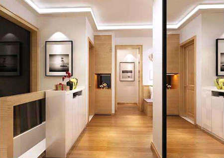 大空间感只有在一个有限度并有对比的范围内才能产生。在大门的旁边做一个玻璃墙面的隔断,不会一进大门之后一览无余,也符合风水。隔断的处理可以正对大门做一个类似照壁的形式。