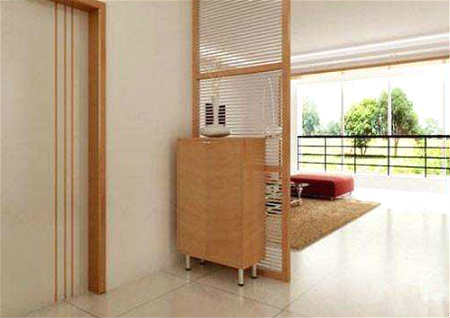 放置玄关柜阻隔大门和阳台,在大门入口处放置鱼缸(命中忌水者不可放鱼缸,可以屏风取代)。
