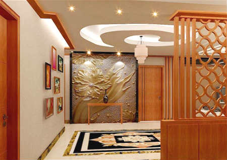 天花板高,则玄关空气流通较为舒畅,对住宅的风水也大有裨益。玄关天花棚上上忌打太多的井字格,内藏灯管,下面用彩绘玻璃相隔,家居中主要的活动区域尤其是天花板部位忌出现太多网状的格状吊棚。顶棚上打造了疏而不漏的格,于人于己都不利。