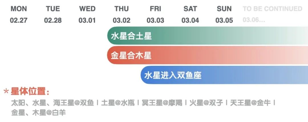 水星进入失势的位置双鱼座后,正面能量有所减弱,大家容易精神不集中、犯懒犯迷糊,在细节上出错的概率增加,也容易因为表达太过暧昧不明,让人误解,导致沟通效率低下、事情反复等等,所以很多人近期会觉得“是不是水逆了”,实际上并没有,只是水星正面能量减弱导致的。不过双鱼座的水星也会赋予大家丰富的想象力与感性力量,有助于艺术创作、心灵疗愈和人际关系缓和。